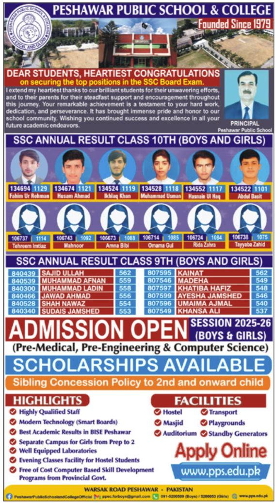 Peshawar Public School & College 10 admissions 2025 has been announced. Students can enroll for admissions in Peshawar Public School & College Peshawar Khyber Pakhtunkhwa KPK Pakistan for academic year 2025 to continue campus based or online education in Science College. Students for admissions in & criteria can apply as per Government institute admission policy 2025 before closing date as per advertisement. Read newspaper ad for exact details.