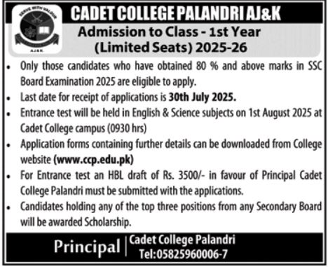 11th Class Admissions 2025 open in Cadet College