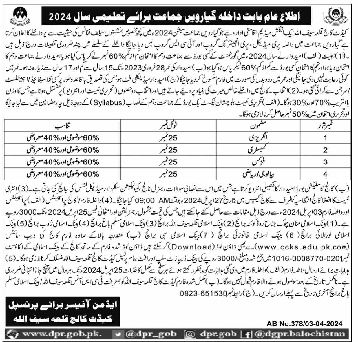 Admissions in Cadet College 2024 for 11th Class has been announced. Students can enroll for admissions in Cadet College Killa Saifullah Balochistan Pakistan for academic year 2024 to continue campus based or online education in Science College. Students for admissions in Intermediate & criteria can apply as per Government institute admission policy 2024 before closing date April 25, 2024 as per advertisement. Read newspaper ad for exact details.