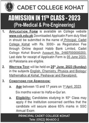 Cadet College has announced admissions 2023 for 11th Class. Cadet College Kohat Khyber Pakhtunkhwa KPK Pakistan welcomes students to apply for admissions in academic year 2023 in Science College. Eligible candidates for admissions in Intermediate can apply as per Government institute criteria and before closing date 5 June 2023 after reading advertisement online. Read newspaper ad for exact details.