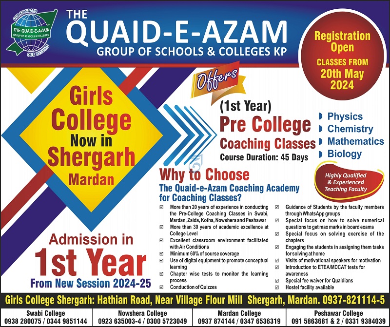 The Quaid e Azam Group of Schools and Colleges 11th Class, Pre College Coaching Classes admissions 2024 has been started. Eligible students who qualify as per admission criteria in The Quaid e Azam Group of Schools and Colleges Mardan Khyber Pakhtunkhwa KPK Pakistan can apply in Science College for academic year 2024. Students for admissions in Intermediate can apply for online or campus classes as per Private institute criteria till admission closing date May 19, 2024. Read newspaper ad for exact details.
