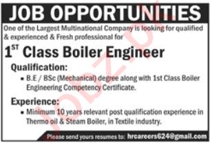 Vacant posts including boiler engineer and first class boiler engineer are announced in Multinational Company Lahore, lahore Punjab Pakistan as per 15 December 2024 advertisement in daily Jang Newspaper. Persons with Others, DAE, Intermediate and Bachelor etc. education can apply.