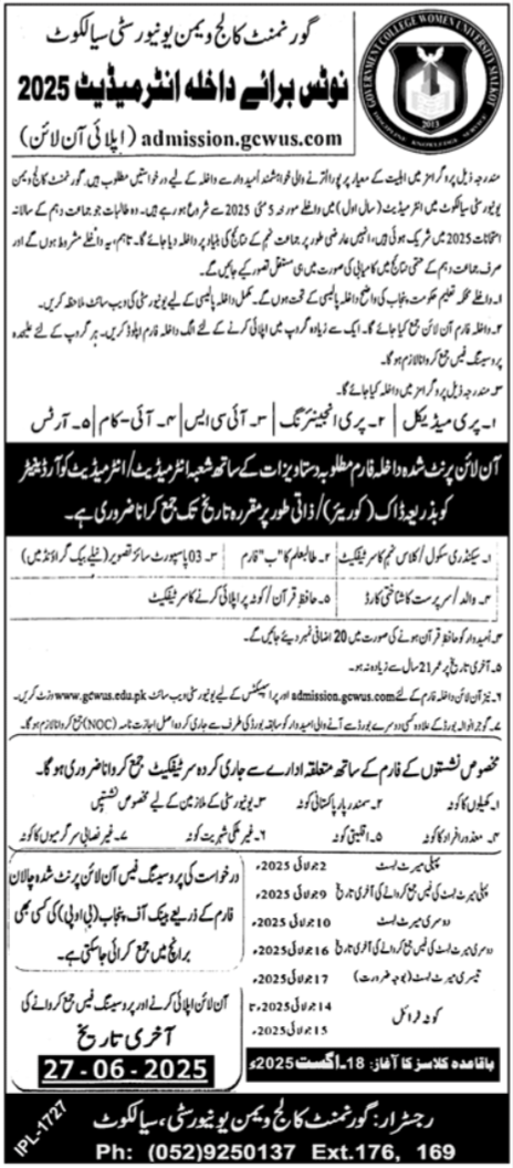 Government College Women University Sialkot GCWU admissions 2025 for 1st year has been announced. Students can enroll for admissions in Government College Women University Sialkot GCWU Sialkot Punjab Pakistan for academic year 2025 to continue campus based or online education in Science College. Eligible students for fulfilling criteria for admissions in can enroll as per Government admission policy 2025 till closing date. Read newspaper ad for exact details.