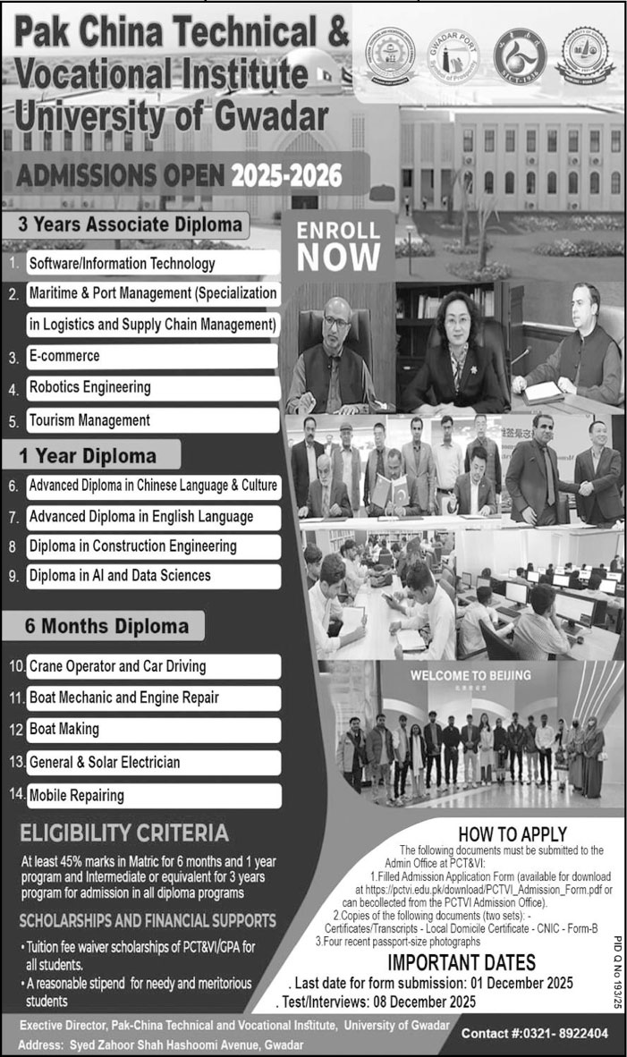 Pak China Technical & Vocational Institute admissions 2025 for 2 years has been announced. Eligible students can apply for academic admissions 2025 in Pak China Technical & Vocational Institute Gwadar Sindh Pakistan for Science College. Students who want to enroll for academic session 2025 in qualification and admission criteria for Government institute can apply till last date. Read newspaper ad for exact details.