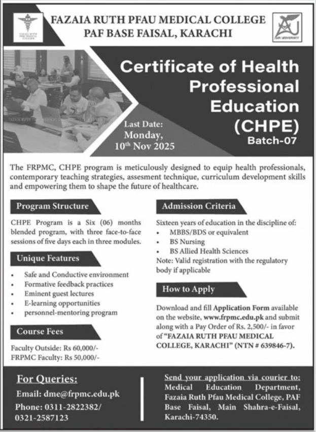 Fazaia Ruth PFAU Medical College has announced admissions 2025 for 2 Years Diploma Progam . Fazaia Ruth PFAU Medical College Karachi Sindh Pakistan welcomes students to apply for admissions in academic year 2025 in Science College. Students for admissions in & criteria can apply as per Government institute admission policy 2025 before closing date as per advertisement. Read newspaper ad for exact details.