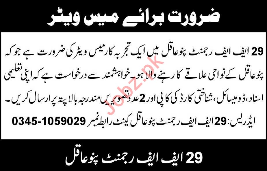 29 FF Regiment Pano Aqil Mess Waiter Job 2018