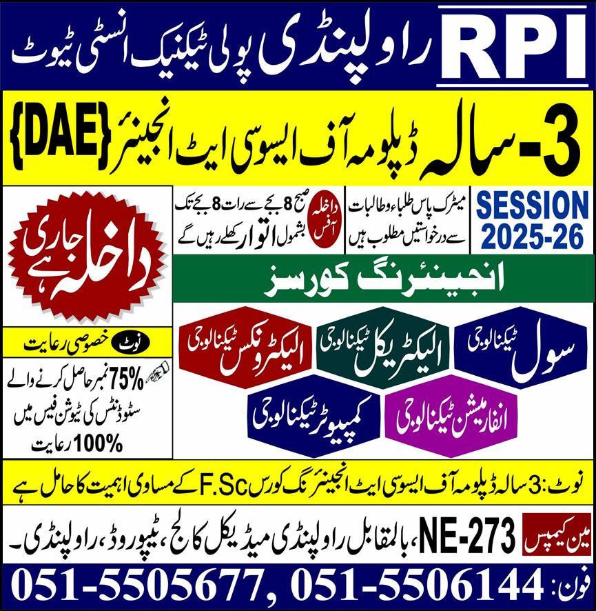 Rawalpindi Polytechnic Institute RPI 3 years Diploma Program admissions 2025 has been started. Rawalpindi Polytechnic Institute RPI Rawalpindi Punjab Pakistan welcomes students to apply for admissions in academic year 2025 in Science College. Students for admissions in & criteria can apply as per Government institute admission policy 2025 before closing date as per advertisement. Read newspaper ad for exact details.