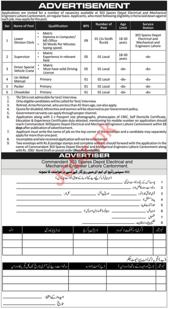 303 Spares Depot Electrical & Mechanical Engineer EME Lahore Cantt, Pakistan Army, Government of Pakistan is seeking experienced candidates for the posts of Lower Division Clerk, LDC, Clerk, Supervisor, Driver, Driver Special Vehicle Crane, Labour, Packer, Chowkidar, Watchman.