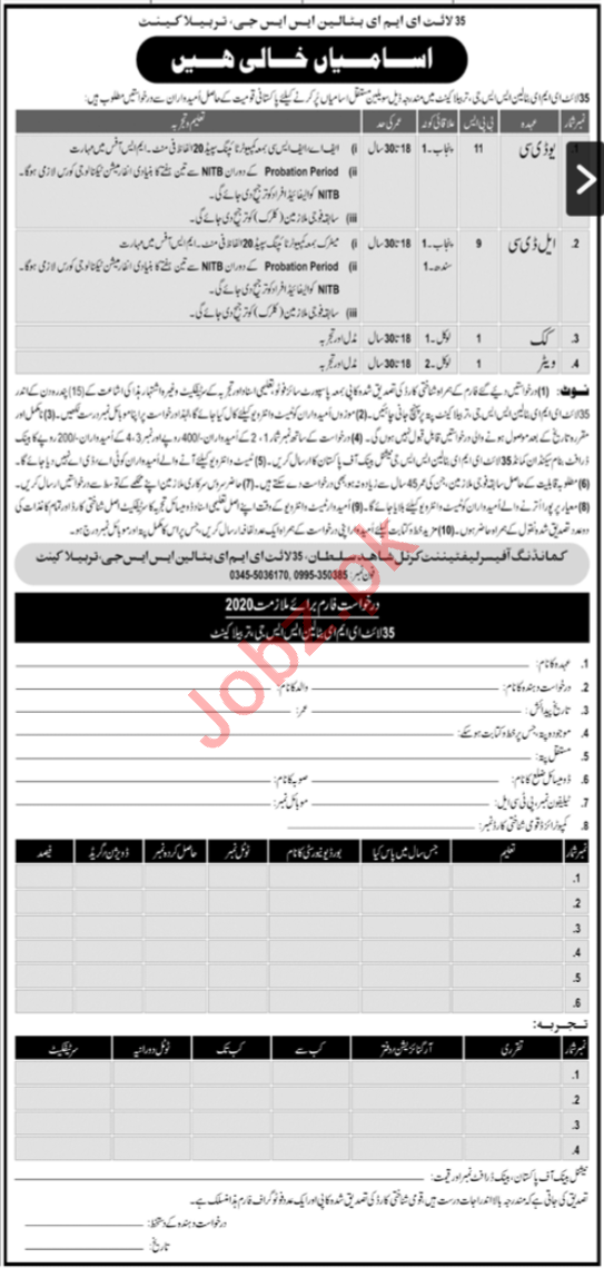 35 Light EME Battalion SSG Tarbela Cantt Jobs 2020 For Clerk