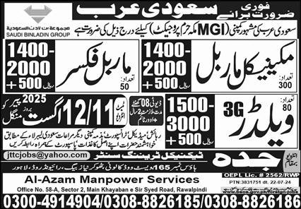 Jeddah Technical Trade Center Makkah, jeddah Saudi Arabia invites applications from eligible candidates for the post of mechanical marble fixer, marble fixer, 3g welder and welder as per advertisement of August 9, 2025 published in daily Express Newspaper. Preferred Education is Intermediate, Bachelor, Others, DAE and Matric etc.