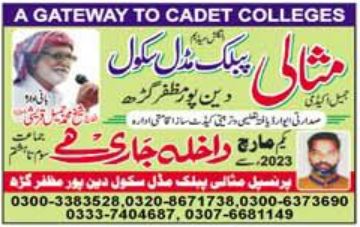 Misali Public Middle School 3rd Class to 8th Class admissions 2023 has been announced. Students who want to take admissions in Misali Public Middle School Muzaffargarh Punjab Pakistan for academic year 2023 to continue education in Science School can apply. Students who want to enroll for academic session 2023 in Primary and Middle qualification and admission criteria for Private institute can apply till last date 26 April 2023. Read newspaper ad for exact details.