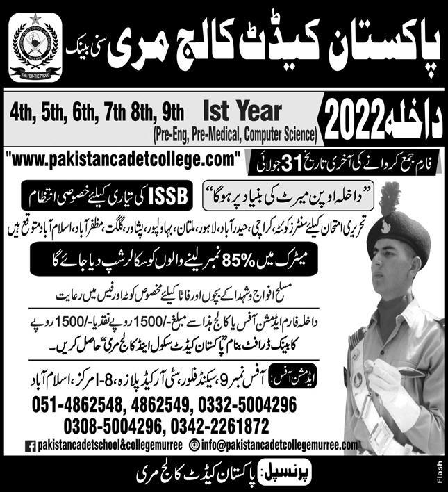 Pakistan Cadet College has announced admissions 2022 for 4th Class, 5th Class, 6th Class, 7th Class, 8th Class, 9th Class, 1st Year. Eligible students who qualify as per admission criteria in Pakistan Cadet College Murree Punjab Pakistan can apply in Science College for academic year 2022. Students for admissions in Intermediate, Middle, Primary and Matric & criteria can apply as per Private institute admission policy 2022 before closing date July 31, 2022 as per advertisement. Read newspaper ad for exact details.