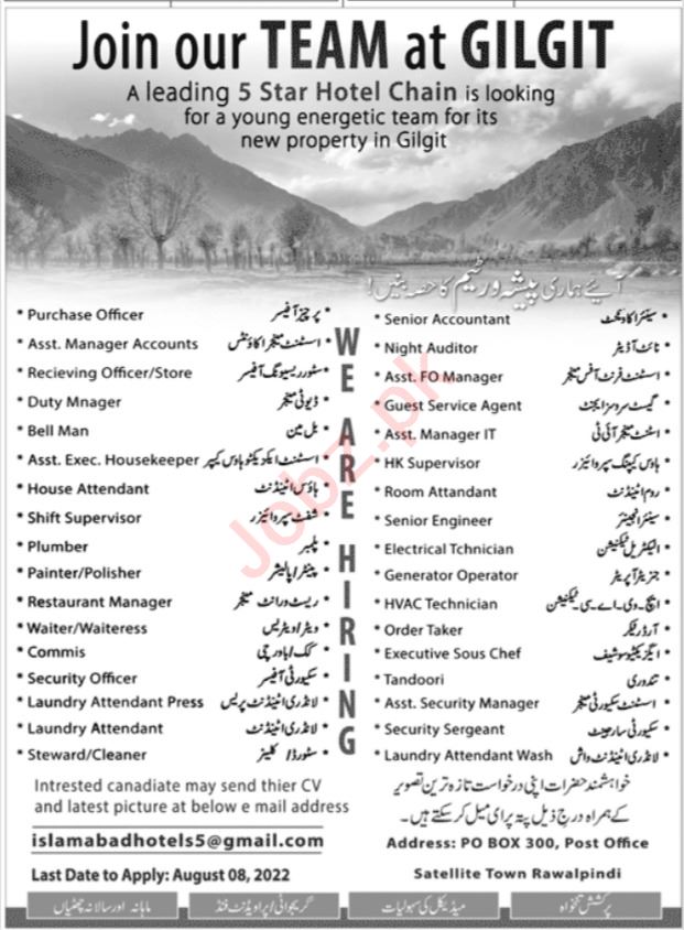 5 Star Hotel is looking for candidates for following posts as per job advertisement published in daily Jang Newspaper of July 31, 2022 for location Gilgit, gilgit Gilgit Baltistan Pakistan: