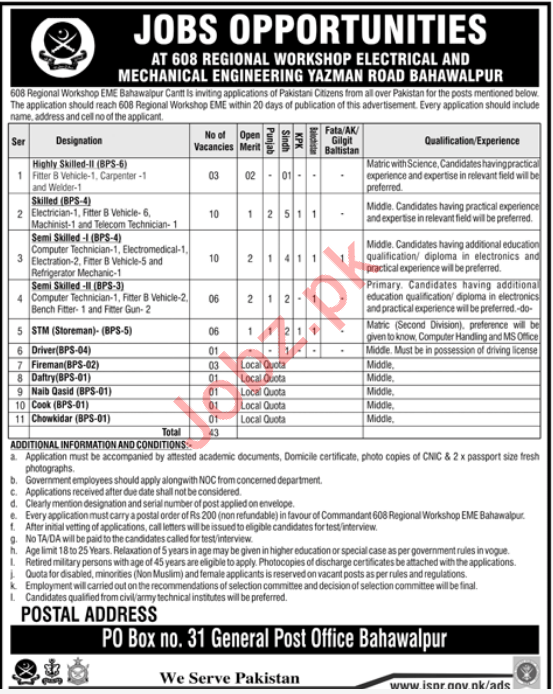 608 Regional Workshop Electrical and Mechanical Engineering Bahawalpur, Pakistan Army, Government of Pakistan required candidates for the posts of Fitter B Vehicle, Carpenter, Welder, Electrician, Machinist, Telecon Technician, Computer Technician, Electromedical, Refrigerator Mechanic, Bench Fitter, STM Storeman, LTV Driver, Fireman, Naib Qasid, Cook and Chowkidar.