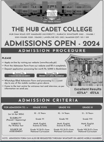 The Hub Cadet College 6th Class, 7th Class, 8th Class, 9th Class admissions 2024 has been announced. Eligible students can apply for academic admissions 2024 in The Hub Cadet College Hub Balochistan Pakistan for Science College. Students for admissions in Matric and Middle & criteria can apply as per Government institute admission policy 2024 before closing date February 5, 2024 as per advertisement. Read newspaper ad for exact details.