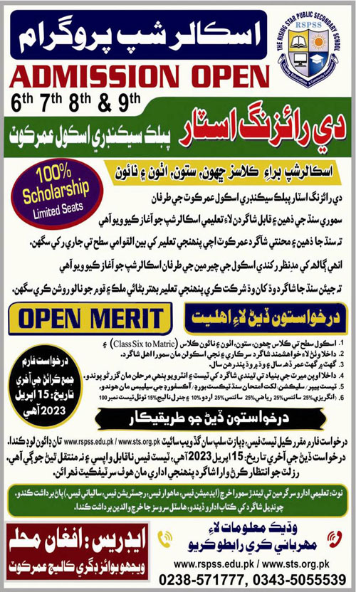 Admissions in The Rising Star Public Secondary School 2023 for 6th Class, 7th Class, 8th Class, 9th Class has been announced. The Rising Star Public Secondary School Umerkot Sindh Pakistan welcomes students to apply for admissions in academic year 2023 in Science School. Eligible candidates for admissions in Middle and Matric can apply as per Private institute criteria and before closing date 15 April 2023 after reading advertisement online. Read newspaper ad for exact details.
