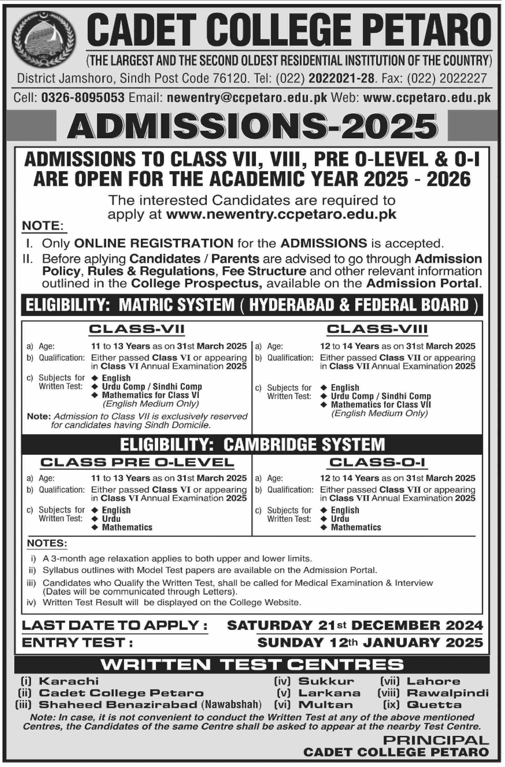 Admissions in Cadet College 2024 for 7th Class, 8th Class, 9th Class, 10th Class has been announced. Students can enroll for admissions in Cadet College Jamshoro Sindh Pakistan for academic year 2024 to continue campus based or online education in Science College. Students for admissions in Matric and Middle can apply for online or campus classes as per Government institute criteria till admission closing date December 21, 2024. Read newspaper ad for exact details.
