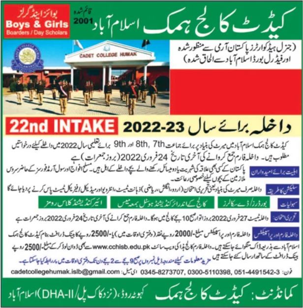 Admissions in Cadet College 2022 for 7th, 8th and 9th Class has been announced. Eligible students who qualify as per admission criteria in Cadet College Islamabad Islamabad Pakistan can apply in Science College for academic year 2022. Eligible candidates for admissions in Middle, BCS and Matric can apply as per Government institute criteria and before closing date 24 February 2022 after reading advertisement online. Read newspaper ad for exact details.