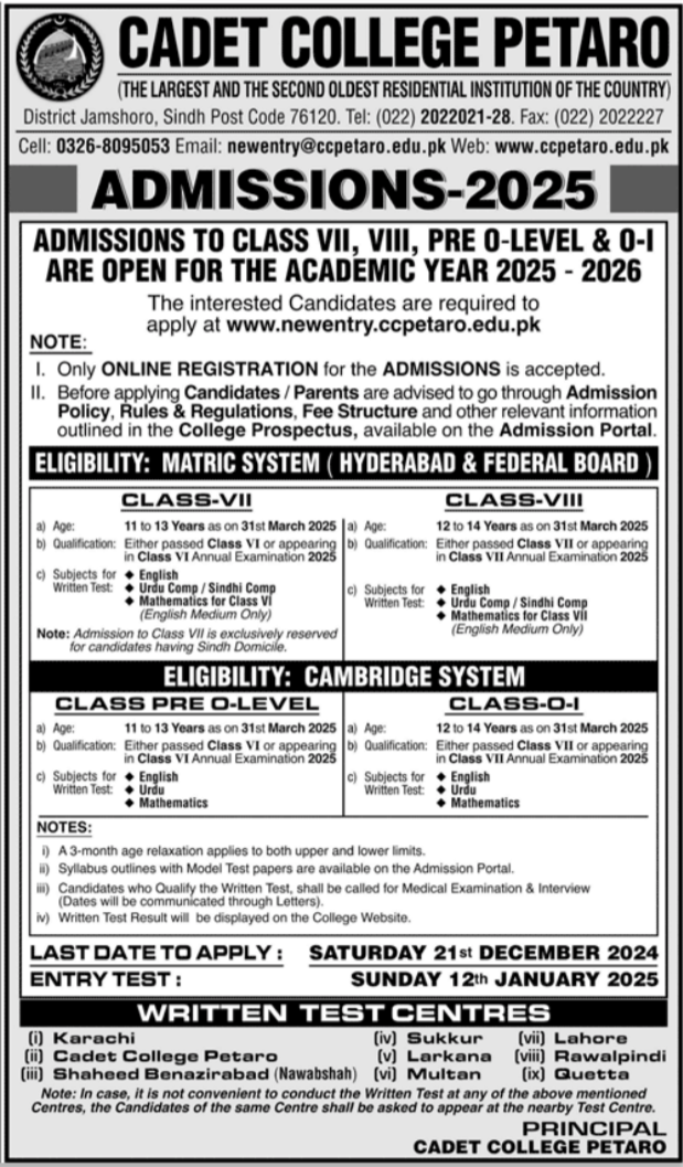 7th, 8th and 9th Classes admissions at Cadet College Petaro