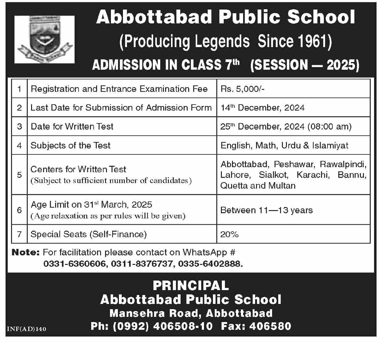 Abbottabad Public School admissions 2024 for 7th Class has been announced. Students can enroll for admissions in Abbottabad Public School Abbottabad Khyber Pakhtunkhwa KPK Pakistan for academic year 2024 to continue campus based or online education in Science School. Students for admissions in Middle can apply for online or campus classes as per Private institute criteria till admission closing date December 14, 2024. Read newspaper ad for exact details.