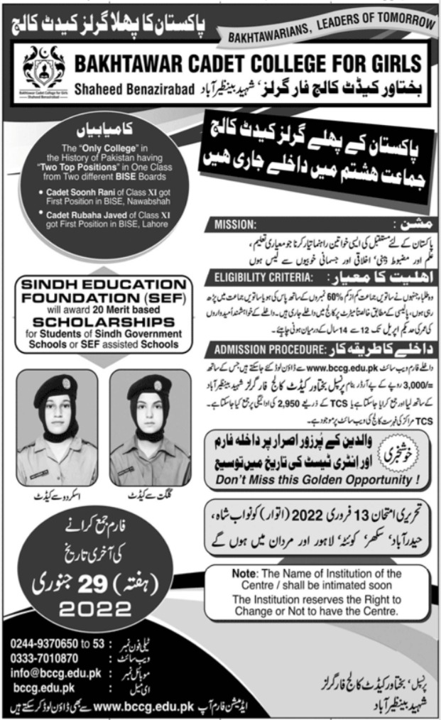 Admissions in Bakhtawar Cadet College 2022 for 8th, 9th, 10th, 11th and 12 Classes has been announced. Eligible students who qualify as per admission criteria in Bakhtawar Cadet College Nawabshah Sindh Pakistan can apply in Science College for academic year 2022. Eligible candidates for admissions in Middle, Intermediate and Matric can apply as per Government institute criteria and before closing date 9 February 2022 after reading advertisement online. Read newspaper ad for exact details.