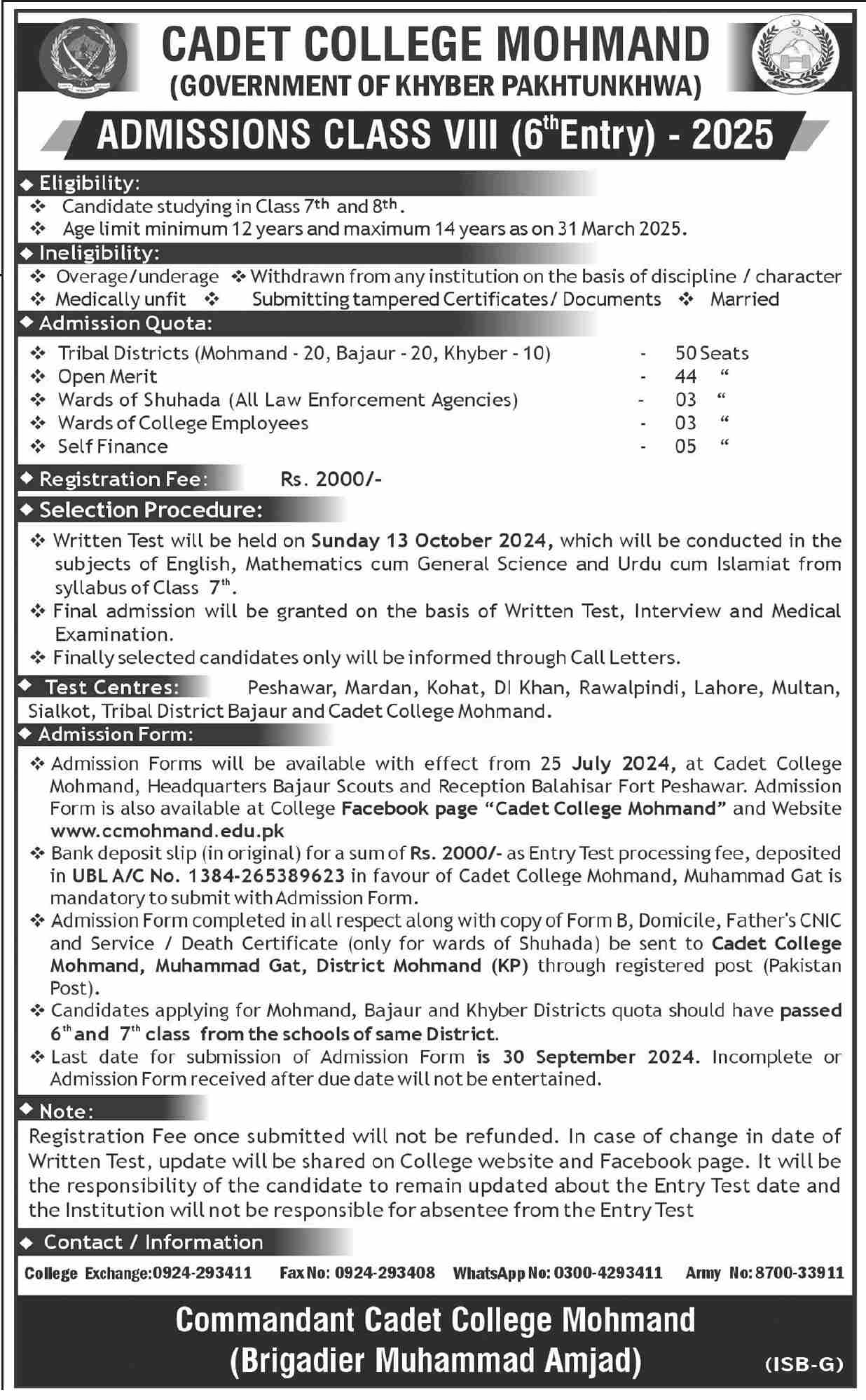 Cadet College 8th Class admissions 2024 has been started. Eligible students can apply for academic admissions 2024 in Cadet College Mohmand Agency Khyber Pakhtunkhwa KPK Pakistan for Science College. Eligible candidates for admissions in Middle can apply as per Government institute criteria and before closing date 30 September 2024 after reading advertisement online. Read newspaper ad for exact details.
