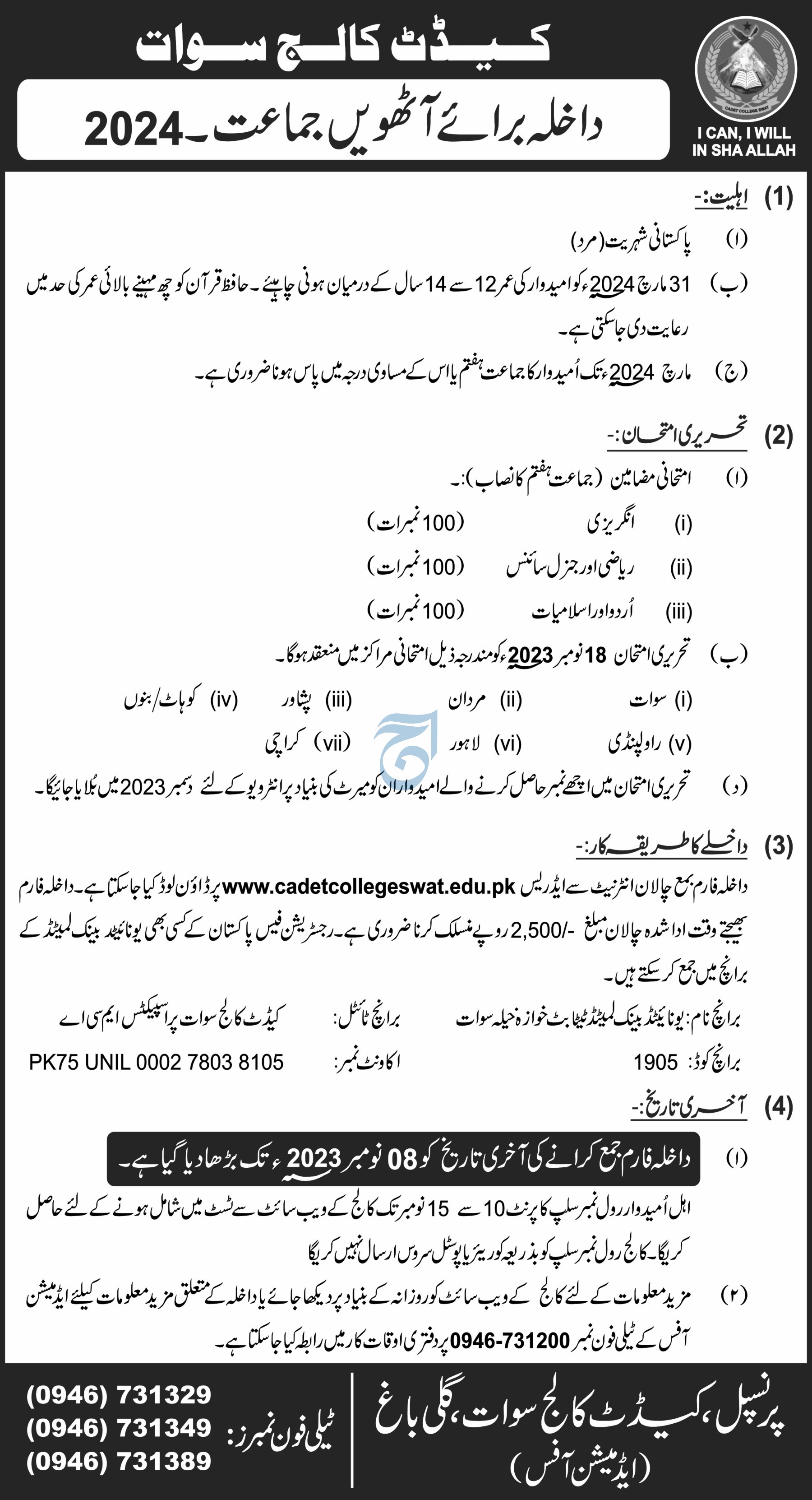 Admissions in Cadet College 2023 for 8th Class has been announced. Cadet College Swat Khyber Pakhtunkhwa KPK Pakistan welcomes students to apply for admissions in academic year 2023 in Science College. Eligible students for fulfilling criteria for admissions in Middle can enroll as per Government admission policy 2023 till closing date 8 November 2023. Read newspaper ad for exact details.