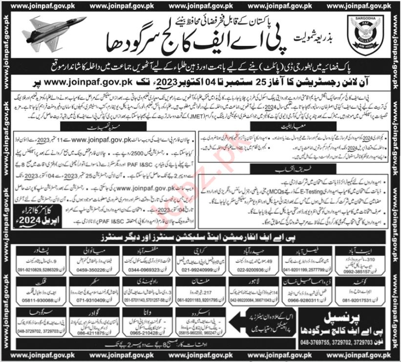 PAF College invites applications for job positions advertised in daily Jang dated 10 September 2023 for following vacancies in Sargodha, sargodha Punjab Pakistan.