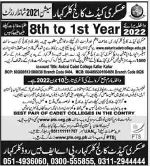 Admissions in Askari Cadet College 2022 for 8th Class to 1st Year Classes has been announced. Eligible students can apply for academic admissions 2022 in Askari Cadet College Chakwal Punjab Pakistan for Science College. Eligible candidates for admissions in Middle, Intermediate and Matric can apply as per Government institute criteria and before closing date 10 June 2022 after reading advertisement online. Read newspaper ad for exact details.