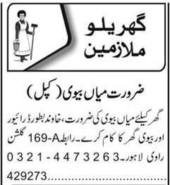 House jobs advertisement dated about 12 May 2025 in daily Roznama 92 News Newspaper invites application for the vacant post of driver, house maid and husband wife in Gulshan Ravi Lahore, lahore Punjab Pakistan. Persons with Middle and Primary etc. education can apply.