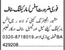 Marketing Company invites applications for job positions advertised in daily Roznama 92 News dated 3 February 2025 for following vacancies in Lahore, lahore Punjab Pakistan.