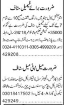 Vacant posts including call center agent, manager accounts, pa, civil engineer, purchaser, electrical engineer, security guard, electrical diploma holder, engineer, admin assistant and personal assistant are announced in Private Company Lahore, lahore Punjab Pakistan as per 23 December 2024 advertisement in daily Roznama 92 News Newspaper. Educational qualifications required B.E, Bachelor, Intermediate, BA, Matric, Middle and DAE etc.
