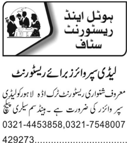 Hotel jobs advertisement dated about 1 December 2025 in daily Roznama 92 News Newspaper invites application for the vacant post of lady supervisor and supervisor in Lahore, lahore Punjab Pakistan. Candidates with Bachelor and Intermediate etc. educational background will be preferred.