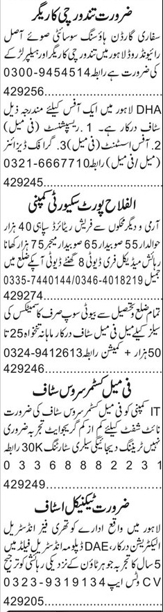 Private Company Lahore, lahore Punjab Pakistan invites applications from eligible candidates for the post of receptionist, subedar major, sipahi, sales staff, customer service staff, office assistant, havaldar, helper, tandoorchi, electrician, graphic designer and subedar as per advertisement of May 6, 2024 published in daily Roznama 92 News Newspaper. Intermediate, Bachelor, BA, Matric, DAE and Middle etc. educational qualification will be preferred.