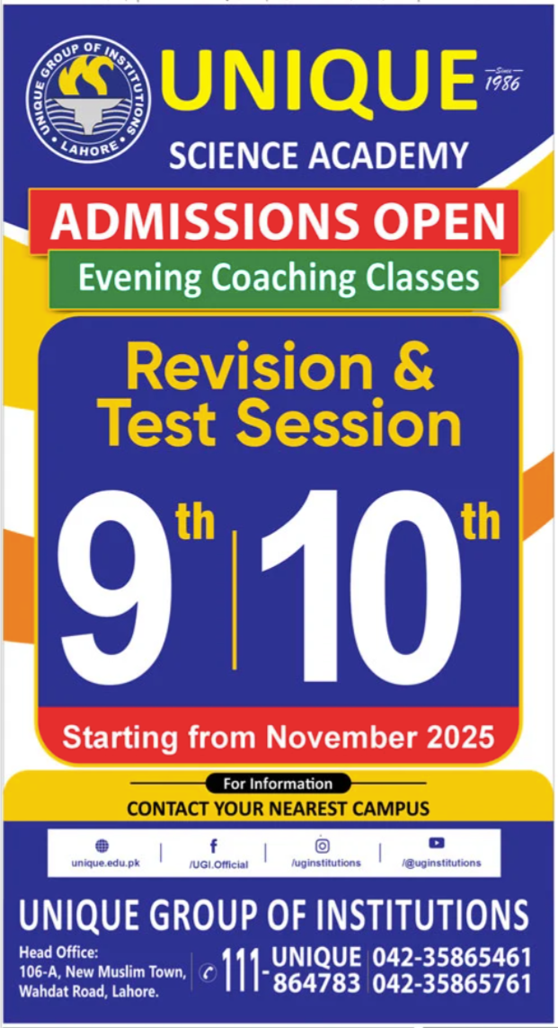 Unique Science Academy 10 admissions 2025 has been announced. Eligible students who qualify as per admission criteria in Unique Science Academy Lahore Punjab Pakistan can apply in Science College for academic year 2025. Students who want to enroll for academic session 2025 in qualification and admission criteria for Government institute can apply till last date 23 October 2025. Read newspaper ad for exact details.