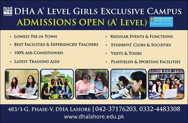 DHA Education System admissions 2025 for A LEVELS has been announced. Students who want to take admissions in DHA Education System Lahore Punjab Pakistan for academic year 2025 to continue education in Science College can apply. Students for admissions in can apply for online or campus classes as per Government institute criteria till admission closing date. Read newspaper ad for exact details.