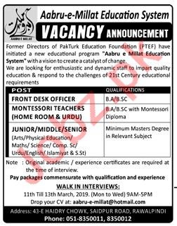 Vacancies in Aabru e Millat Education System Advertisement March 2019