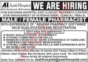 Aadil Hospital Lahore, lahore Punjab Pakistan invites applications from eligible candidates for the post of pharmacist as per advertisement of October 23, 2022 published in daily Jang Newspaper. Preferred Education is B Pharmacy, Pharma D and Bachelor etc.