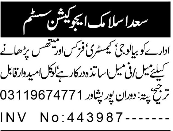 Saad Islamic Education System invites applications for job positions advertised in daily Aaj dated 11 August 2025 for following vacancies in Doranpur Peshawar, peshawar Khyber Pakhtunkhwa KPK Pakistan.