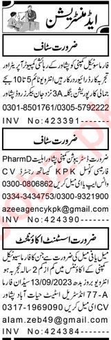 Private Company is looking for candidates for following posts as per job advertisement published in daily Aaj Newspaper of September 11, 2023 for location Peshawar, peshawar Khyber Pakhtunkhwa KPK Pakistan: