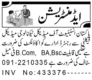 Pakistan Institute of Medical Technologies PIMT Peshawar, peshawar Khyber Pakhtunkhwa KPK Pakistan invites applications from eligible candidates for the post of accountant as per advertisement of August 12, 2024 published in daily Aaj Newspaper. Preferred Education is B.com and BA etc.