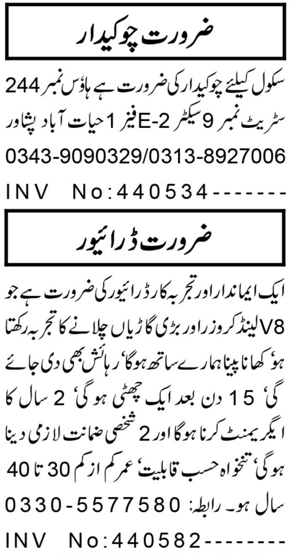 Private Company Hayatabad Peshawar, peshawar Khyber Pakhtunkhwa KPK Pakistan invites applications from eligible candidates for the post of chowkidar, watchman, driver and ltv driver as per advertisement of April 14, 2025 published in daily Aaj Newspaper. Candidates with Matric and Middle etc. educational background will be preferred.