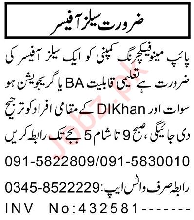 Pipe Manufacturing Industry is looking for candidates for following posts as per job advertisement published in daily Aaj Newspaper of July 15, 2024 for location Swat, dera ismail khan and swat Khyber Pakhtunkhwa KPK Pakistan: