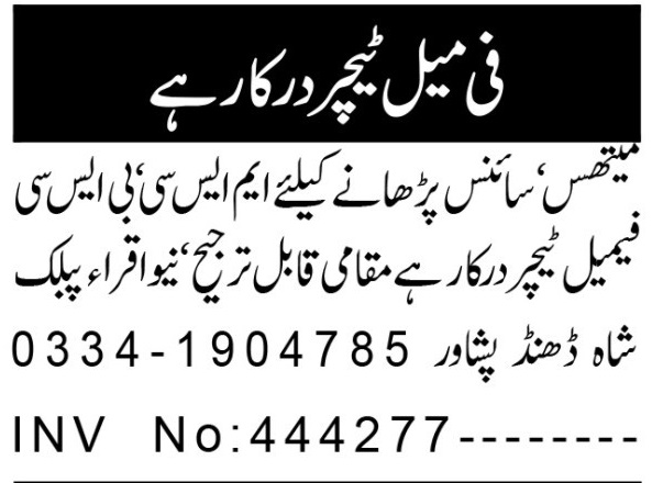 New Iqra Public School invites applications for job positions advertised in daily Aaj dated 18 August 2025 for following vacancies in Peshawar, peshawar Khyber Pakhtunkhwa KPK Pakistan.