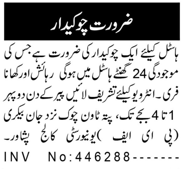 Vacant posts including watchman and chowkidar are announced in Hostel University Road Peshawar, peshawar Khyber Pakhtunkhwa KPK Pakistan as per 20 October 2025 advertisement in daily Aaj Newspaper. Primary and Middle etc. educational qualification will be preferred.