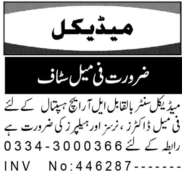 Medical Center Peshawar, peshawar Khyber Pakhtunkhwa KPK Pakistan invites applications from eligible candidates for the post of female doctor, doctor, helper and nurse as per advertisement of October 20, 2025 published in daily Aaj Newspaper. Others, Bachelor, Matric, DAE, Intermediate and MBBS etc. educational qualification will be preferred.