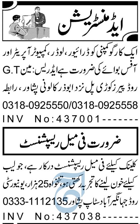 Vacant posts including female receptionist, office boy, receptionist, driver, loader and computer operator are announced in Private Company Peshawar, peshawar Khyber Pakhtunkhwa KPK Pakistan as per 2 December 2024 advertisement in daily Aaj Newspaper. Bachelor, Intermediate, BA, Middle and Matric etc. educational qualification will be preferred.