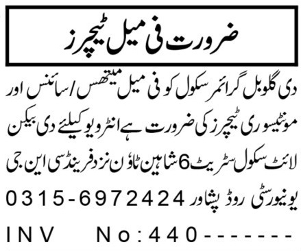 Grammar School University Road Peshawar, peshawar Khyber Pakhtunkhwa KPK Pakistan invites applications from eligible candidates for the post of science teacher, female teacher, teacher, montessori teacher and maths teacher as per advertisement of April 21, 2025 published in daily Aaj Newspaper. Candidates with MA, Master, M.sc and Bachelor etc. educational background will be preferred.