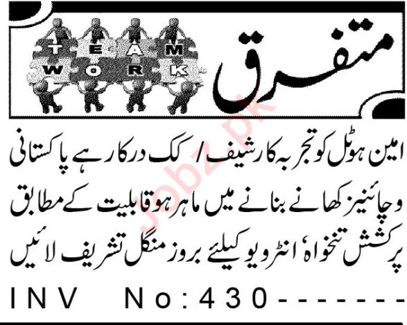 Hotel jobs advertisement dated about 22 April 2024 in daily Aaj Newspaper invites application for the vacant post of chef, cook and chinese cook in Peshawar, peshawar Khyber Pakhtunkhwa KPK Pakistan. Preferred Education is Middle and Matric etc.