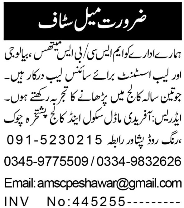 Afridi Model School & College jobs advertisement dated about 22 September 2025 in daily Aaj Newspaper invites application for the vacant post of maths teacher, teacher, biology teacher and lab assistant in Ring Road Peshawar, peshawar Khyber Pakhtunkhwa KPK Pakistan. Persons with Bachelor, Master, Intermediate and M.sc etc. education can apply.